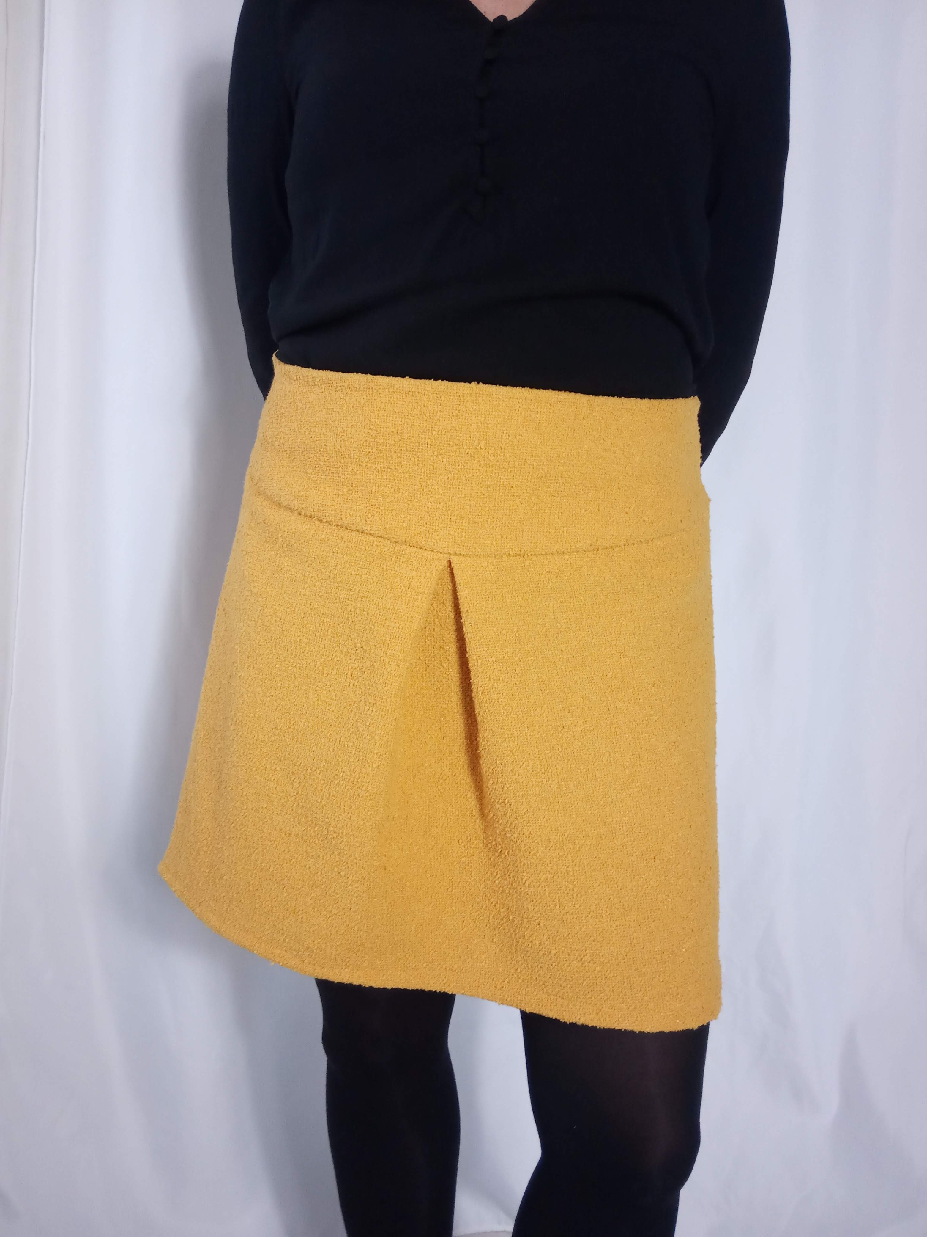 Jupe courte en polycoton aspect légèrement bouclé couleur moutarde, pli ouvert devant, fermeture éclair invisible au dos Sur commande Taille 40 Prix 40.00€