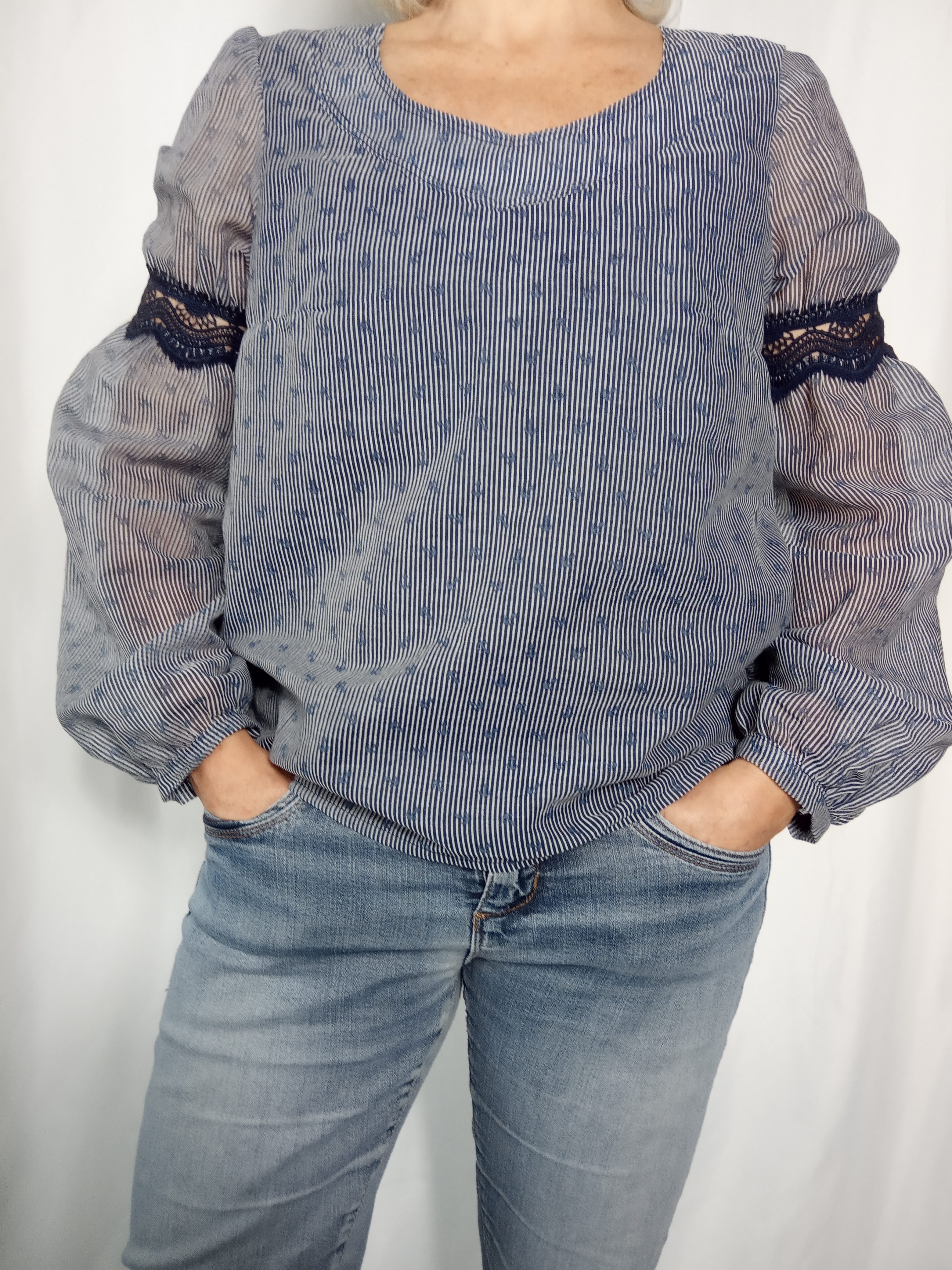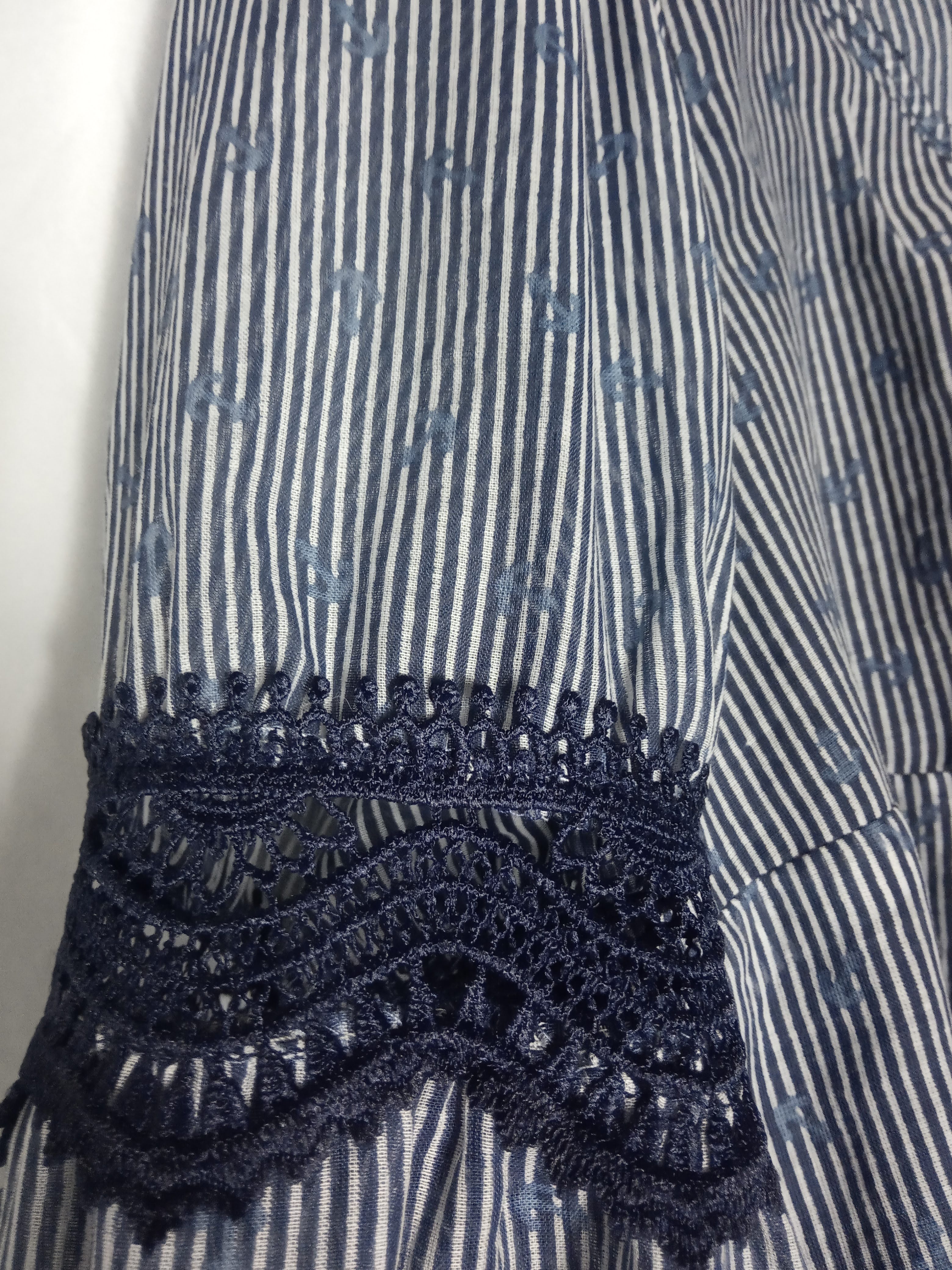 Blouse en voile de coton doublé, motif ancre et rayure marine, col dégagé, manches longues bouffantes resserrées aux bras par un bandeau de dentelle bleu marine Disponible Taille 40 Prix 70.00€