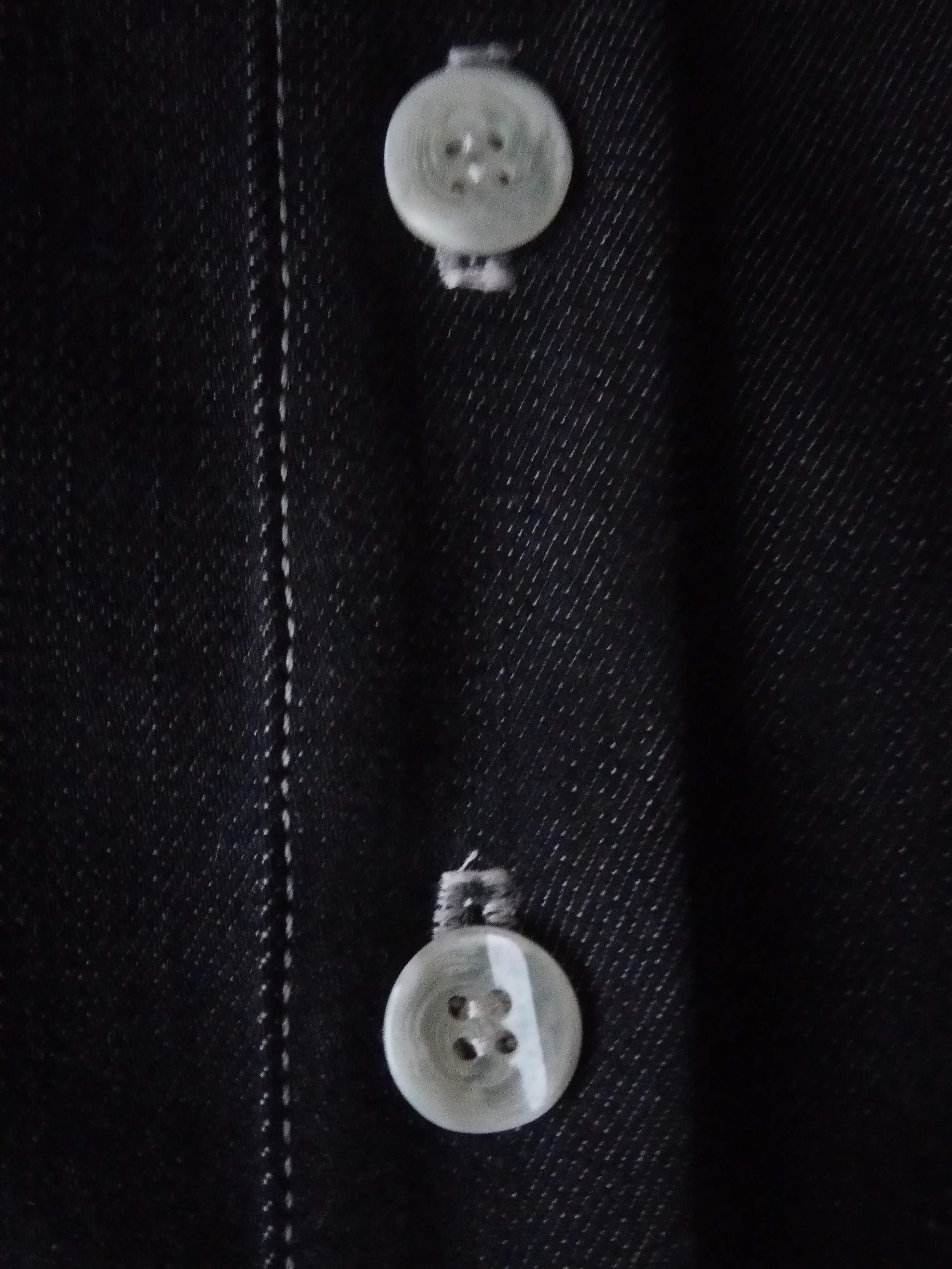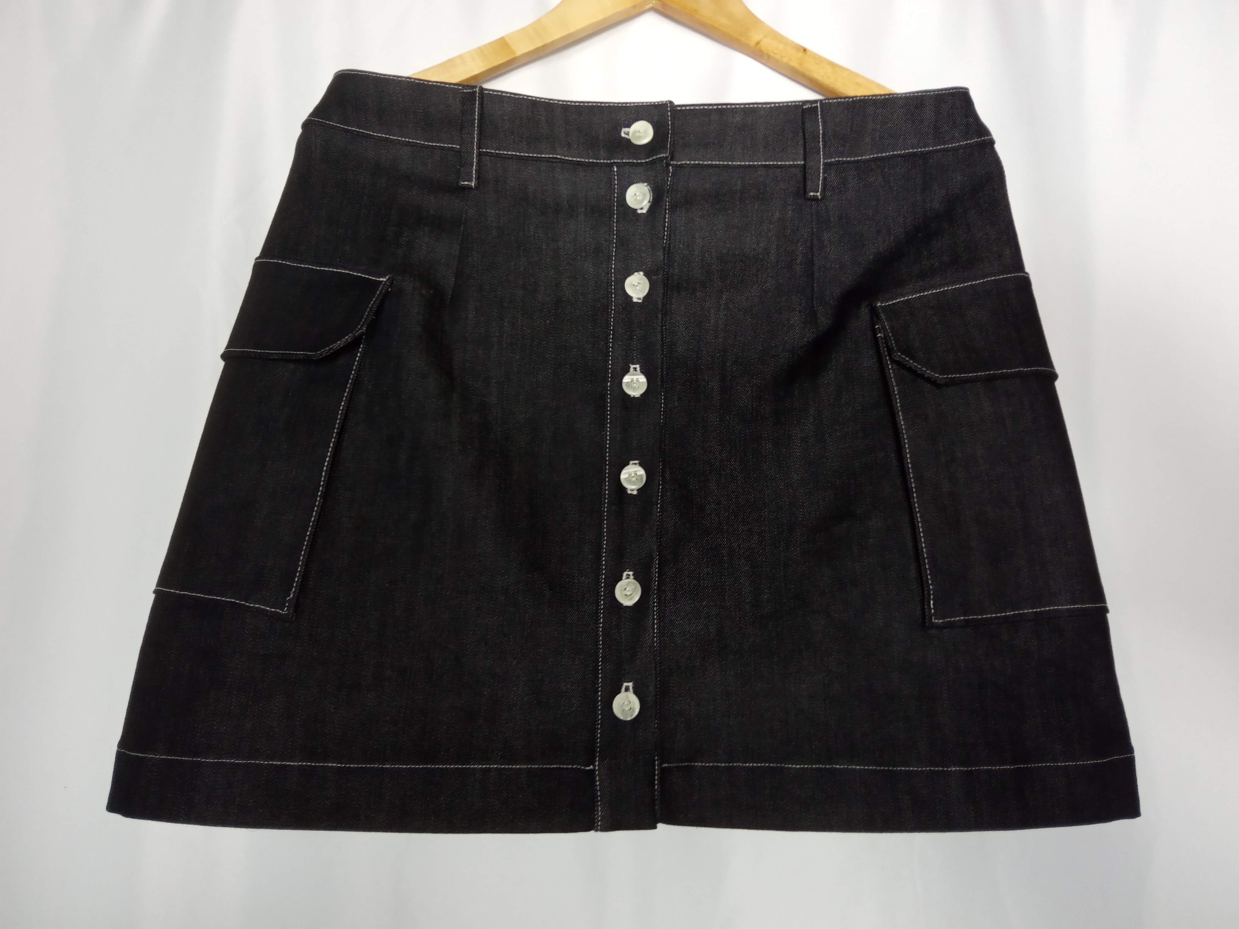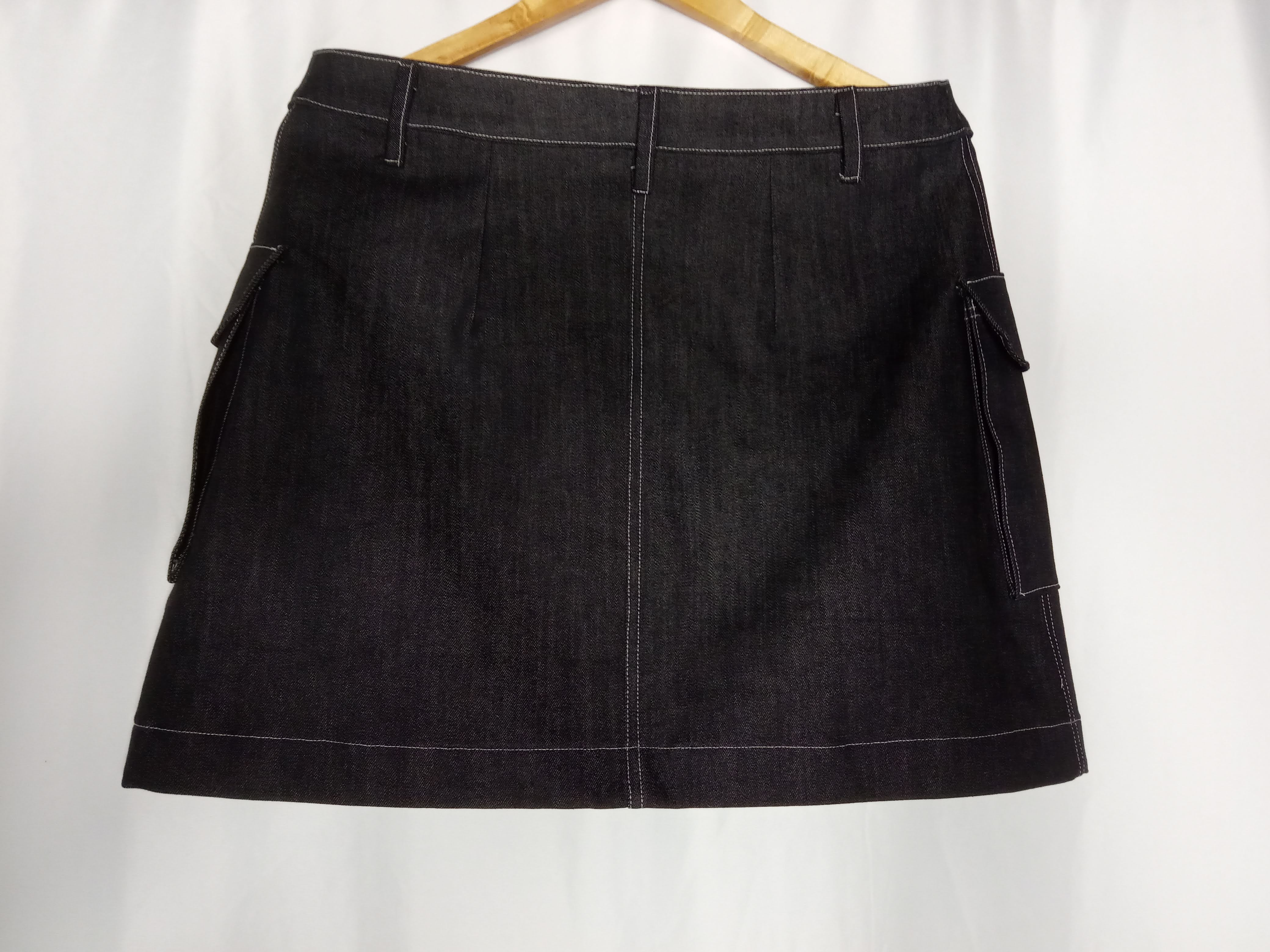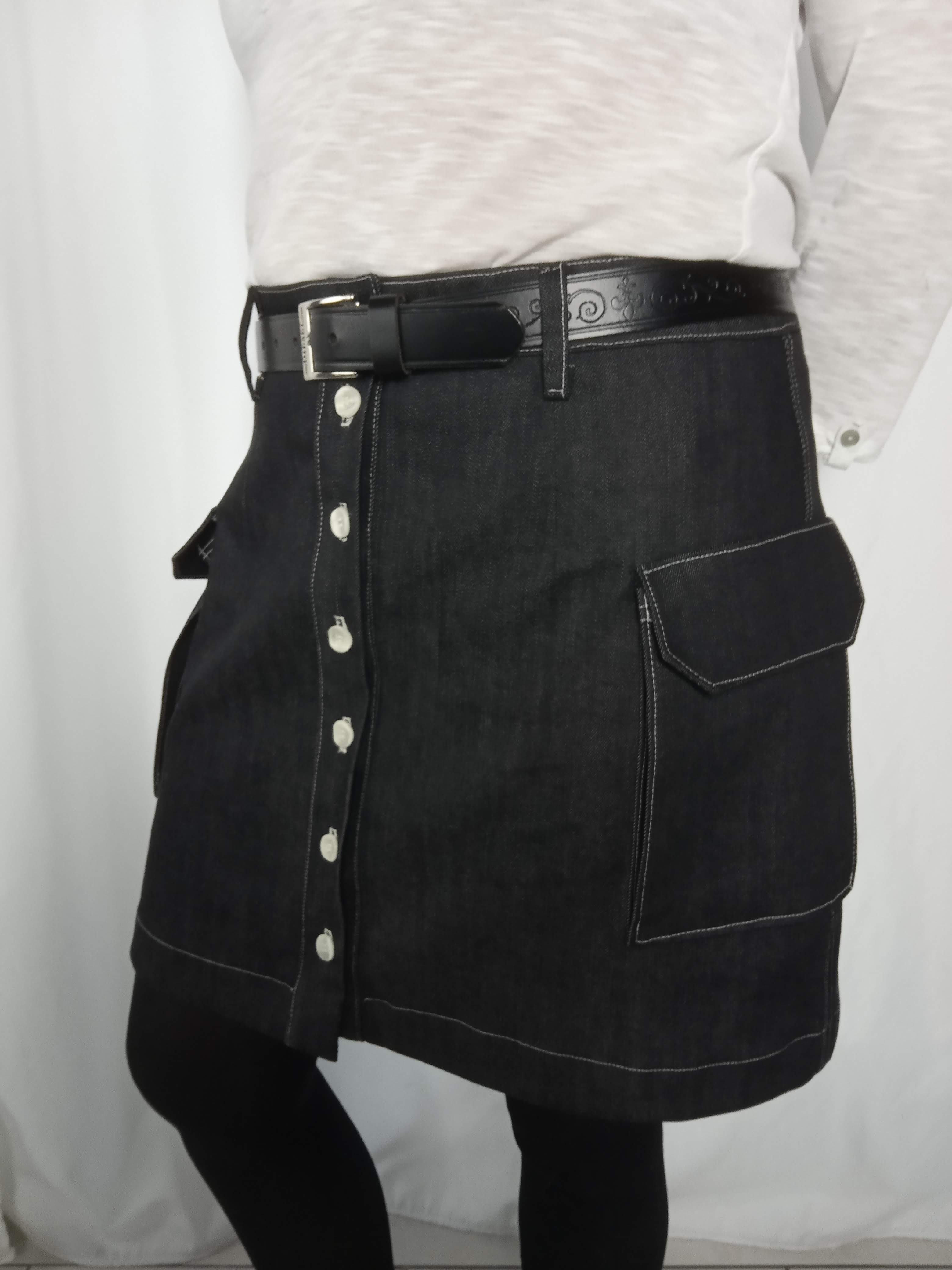 Jupe en jean noir (3% d'élasthanne), poches style cargo, surpiqûres décoratives ivoires, boutons nacrés Disponible Taille 40/42 Prix 50.00€