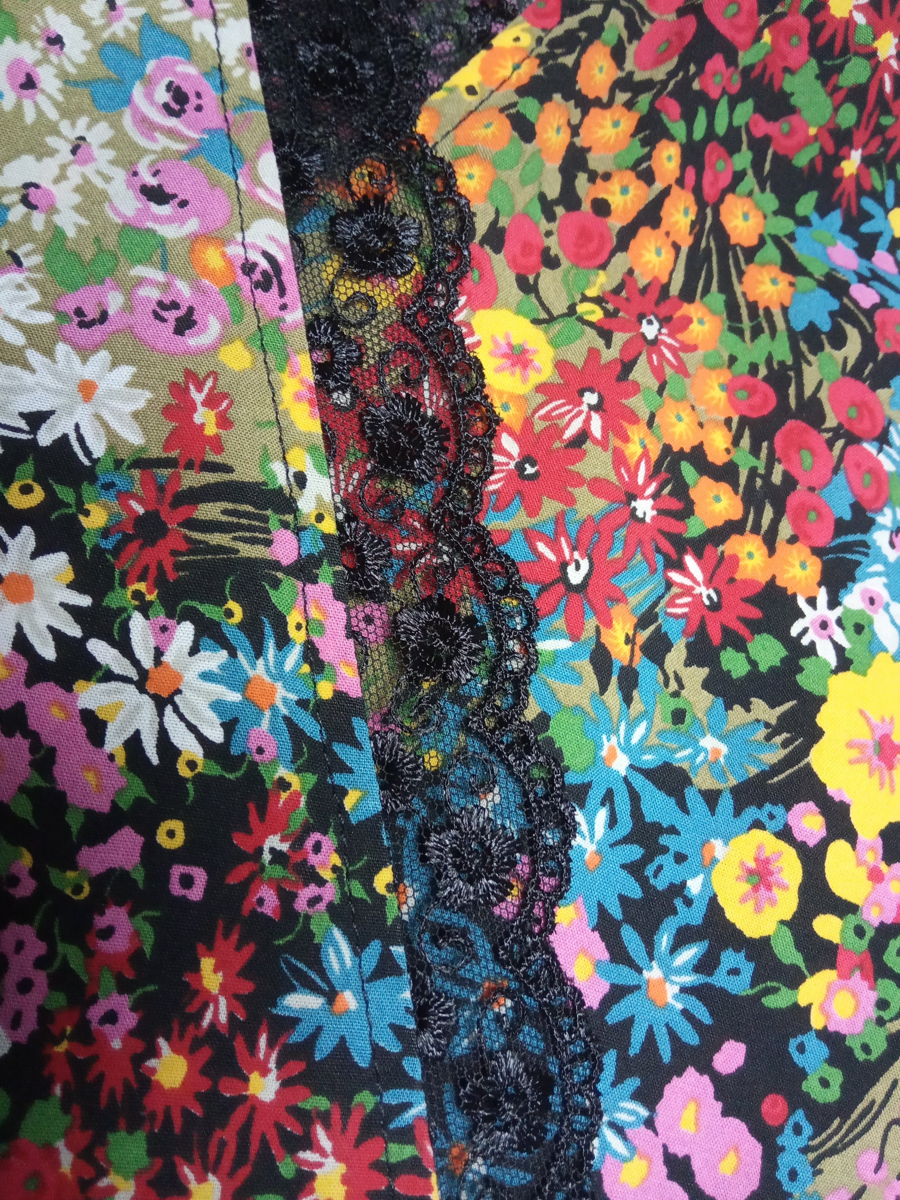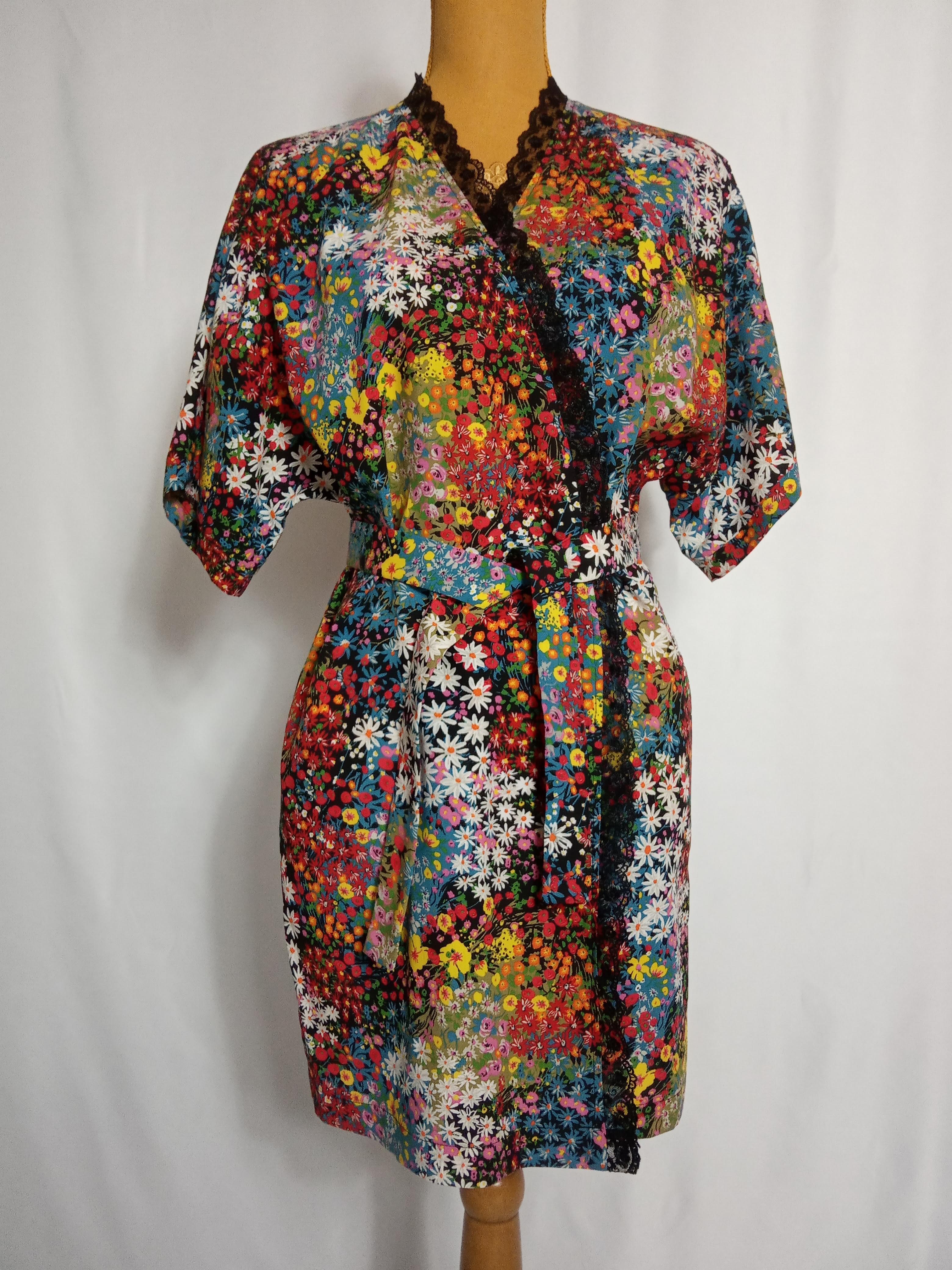 Kimono 100% viscose motif fleuri, bordé de dentelle noire avec ceinture à nouer