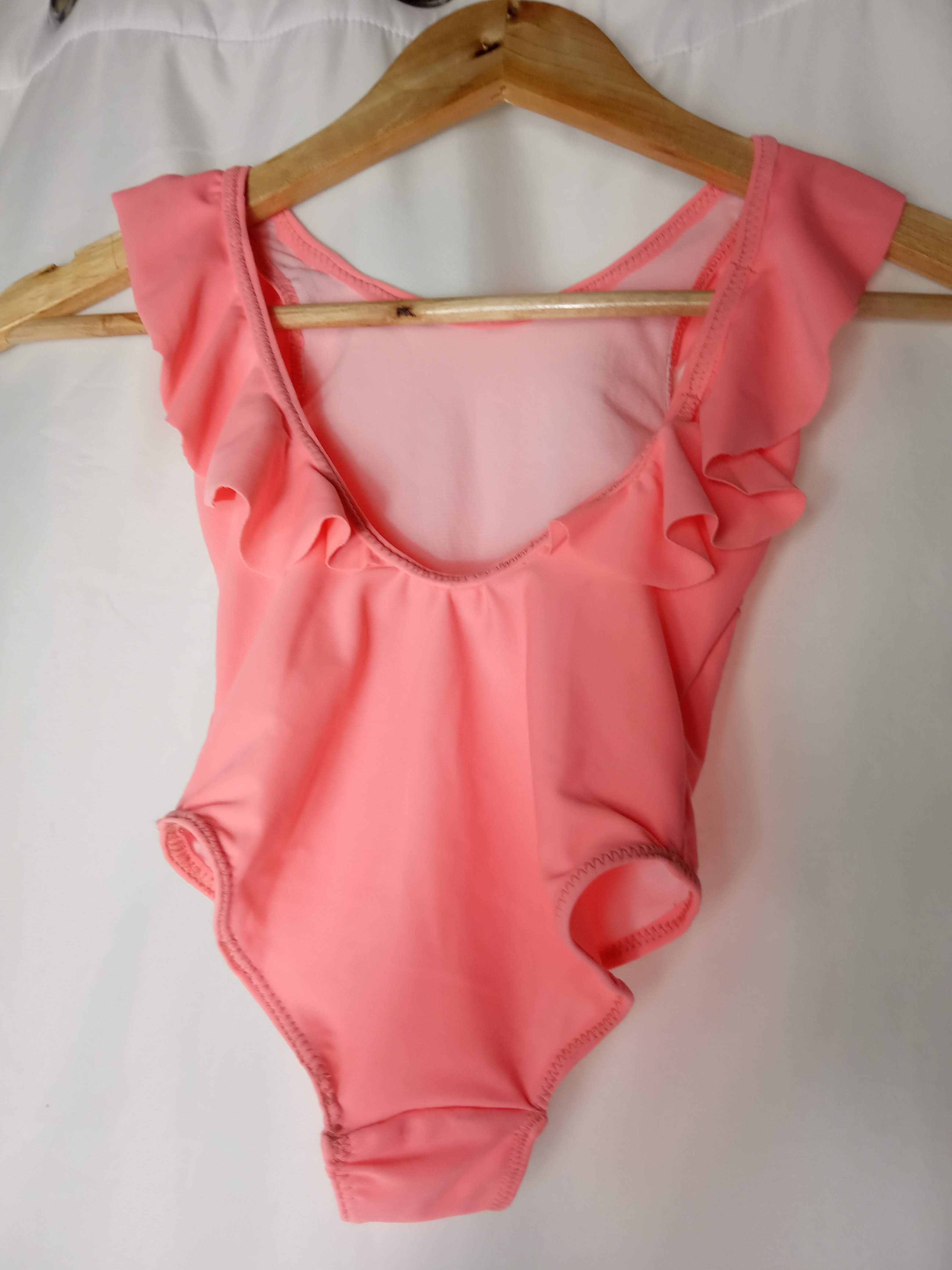 maillot une pièce lycra couleur saumon, broderie devant, volants tout le long de l'encolure devant et dos, dos décolleté Disponible Taille 3 ans Prix 30.00€