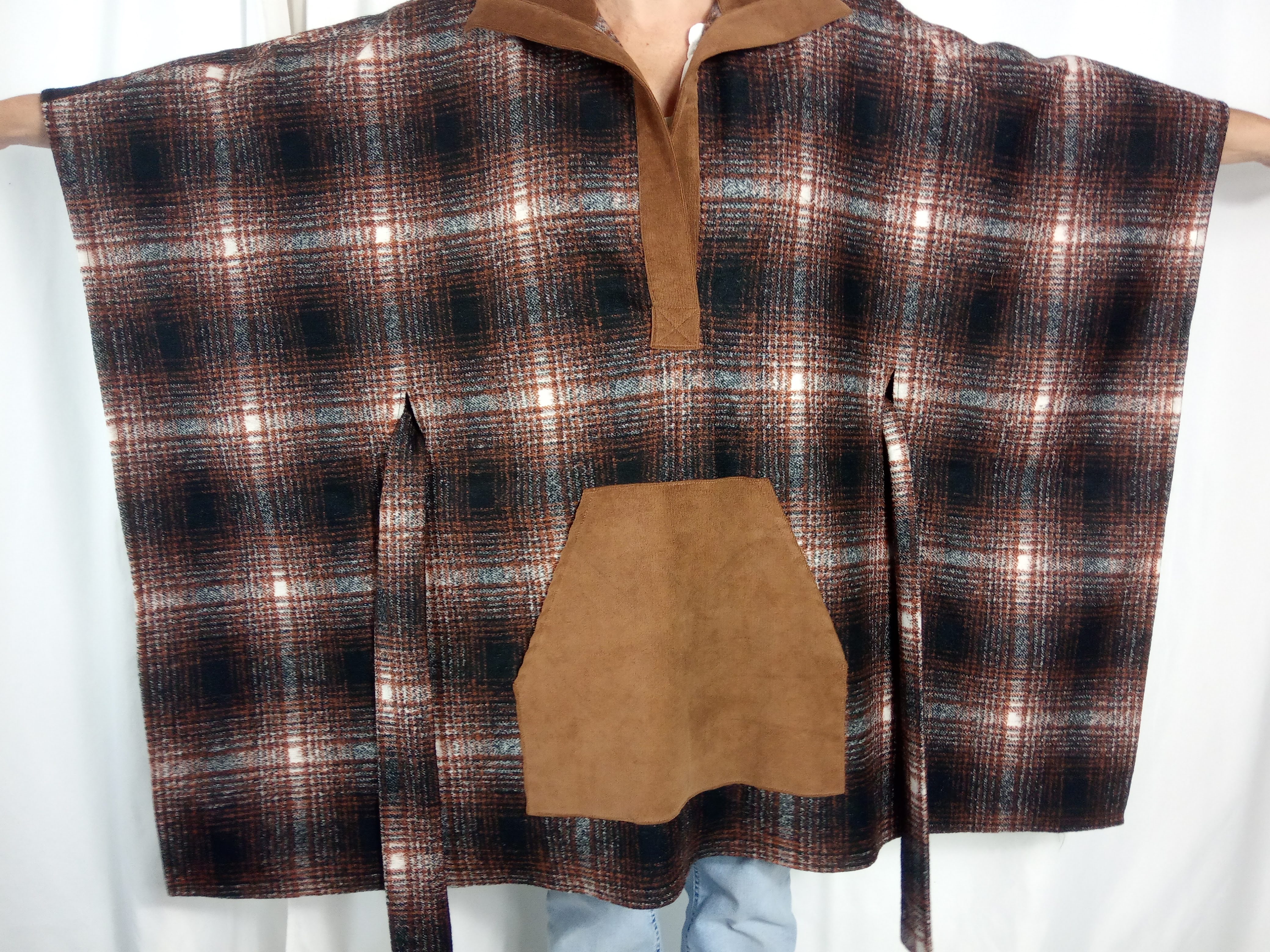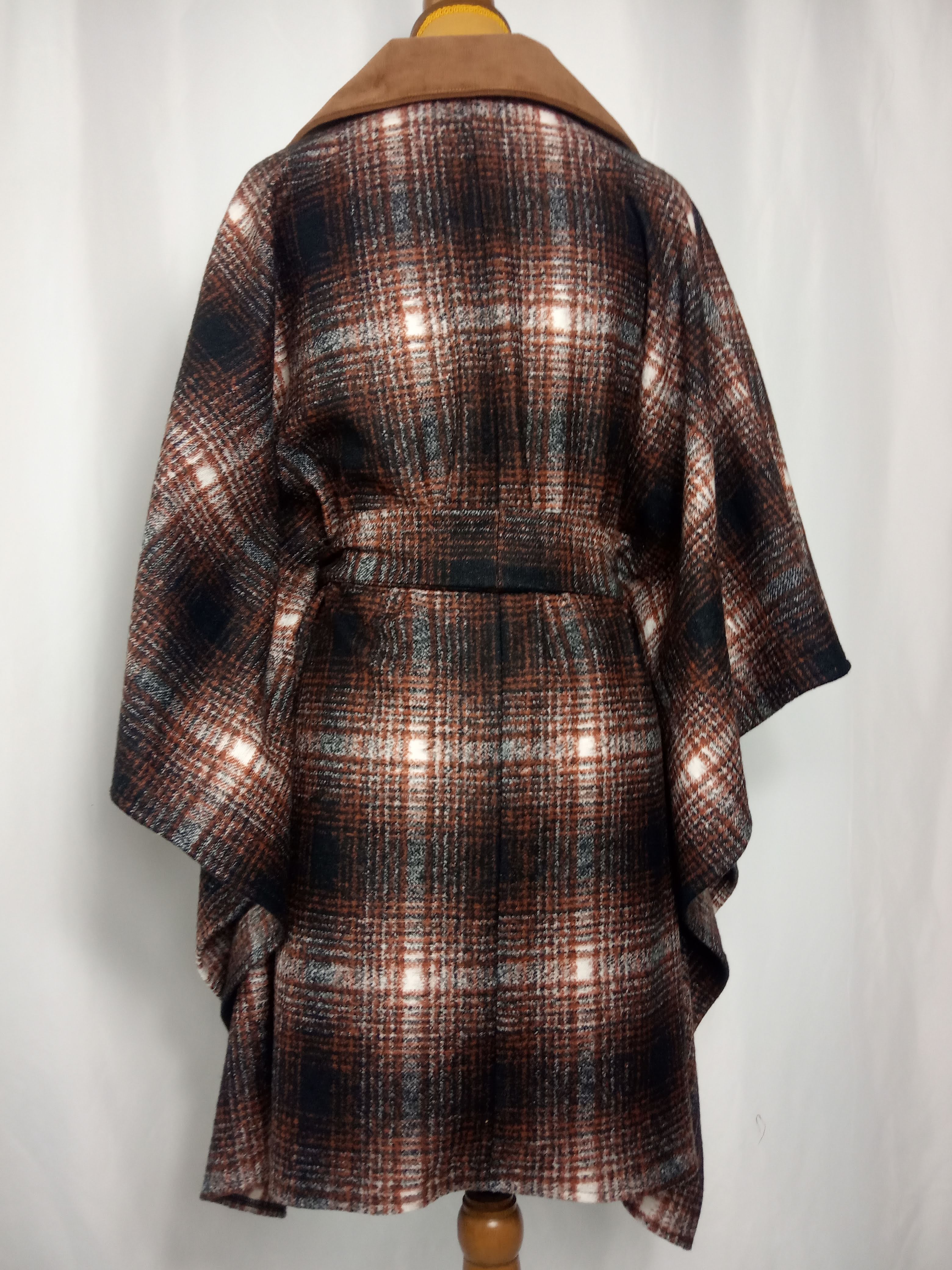 Poncho avec motif à carreaux (marron, noir, orangé, ivoire), 30% laine 70% polyester, col et poche contrastés en velours finement côtelée marron, ceinture amovible Disponible Taille 40/42 Prix 80.00€